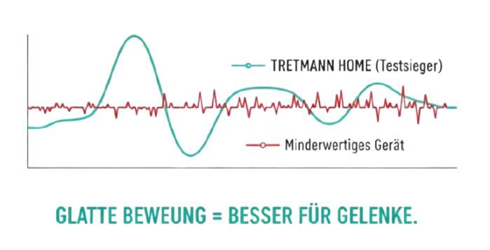Zum Vergleich: Minderwertige Heimtrainer mit einfachen Bremssystemen zeigen in dieser Analyse deutliche Stöße und Ungleichmäßigkeiten im Bewegungsablauf. Diese Mikro-Ruckler ( oft nur Millisekunden lang übertragen sich direkt auf Knie) und Hüftgelenke. Bei regelmäßigem Training können diese wiederkehrenden Mikrobelastungen zu Knorpelschäden führen. Der TRETMANN HOME eliminiert dieses Problem vollständig.